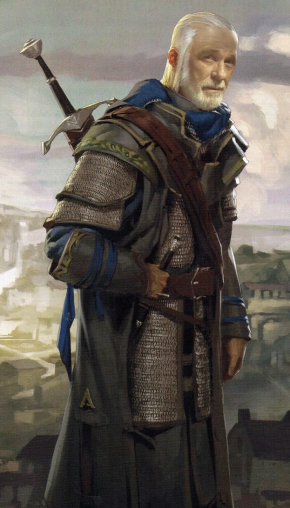 J’ai les yeux or noyés de longs cheveux blancs émergeants d’un chapeau orné de trois plumes : une rouge fraise, une bleu myosotis et une vert chartreuse. Je suis barde de mon état. J’ai été formé par ma mère qui m’a offert sa cornemuse (Uillean pipe) quand je me suis senti prêt à partir exercer mon art et apprendre de nouveaux chants et contes. Cette cornemuse se nomme Brînamyne et se trouve dans notre famille depuis maintes générations.