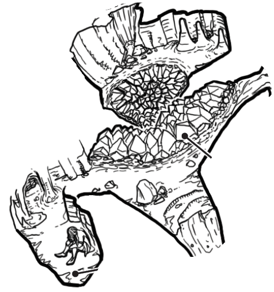 Ces souterrains sont décidément plus remplis qu’ils ne le paraissent… Quelques pas circonspects vous ouvrent la perspective d’un renfoncement dissimulé derrière la Géode, ou semble se tapir un homme répugnant, aux cheveux longs et à la barbe sale. Il lève un bras pour se protéger de la lumière de vos torches et éructe avec une voix qui n’a plus l’habitude de servir :